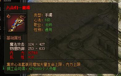 六合归一魔镯。类型:手镯,心法:6级,职业:法师,性别:通用。基础属性——魔法攻击:124-427,物理防御:253-633,内力:+2769(特有),抗性:+18(特有)。集齐心法套装可增加大量生命上限、内力上限。捐工会可得:4276800个人贡献。