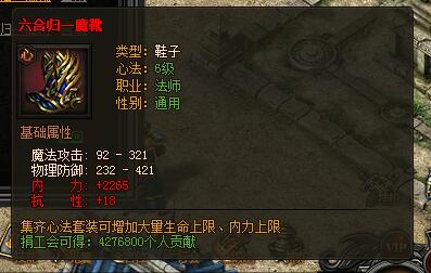 六合归一魔靴。类型:鞋子,心法:6级,职业:法师,性别:通用。基础属性——魔法攻击:92-321,物理防御:232-421,内力:+2265(特有),抗性:+18(特有)。集齐心法套装可增加大量生命上限、内力上限。捐工会可得:4276800个人贡献。