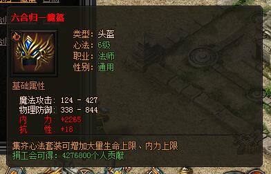 六合归一魔盔。类型:头盔,心法:6级,职业:法师,性别:通用。基础属性——魔法攻击:124-427,物理防御:338-844,内力:+2265(特有),抗性:+18(特有)。集齐心法套装可增加大量生命上限、内力上限。捐工会可得:4276800个人贡献。