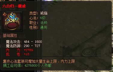 六合归一魔戒。类型:戒指,心法:6级,职业:法师,性别:通用。基础属性——魔法攻击:464-1600,魔法防御:290-727,内力:+2769(特有),抗性:+18(特有)。集齐心法套装可增加大量生命上限、内力上限。捐工会可得:4276800个人贡献。