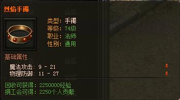 烈焰手镯。类型:手镯。等级:74级。职业:法师。性别:通用。