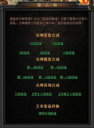 锻造合成会根据玩家扮演的角色不同,改变为不同的职业套装合成。这里由于我们选择的是法师,所以锻造合成只有法师套装合成、法师龙装合成、法师首饰合成以及主宰装备转换。根据套装的不同,又分成为60级装备、70级装备、6转装备、8转装备、10转装备、龙·4转装备、龙·6转装备、龙·8转装备、龙·10转装备、龙·12转装备、万劫套装、[圣]主宰套装、[至尊]主宰套装以及神甲性别转换。