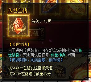 传世宝钻。用于进阶传世装备,可在盟众城神炉处兑换传世装备。双击可快速打开传世神兵界面。