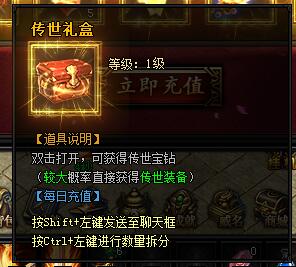 传奇礼盒。双击打开,可获得传世宝钻(较大概率直接获得传世装备)。