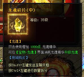 龙魂碎片(中)。双击使用增加1000点龙魂精华。可在[宝物-龙魂]界面消耗龙魂精华升级龙魂。