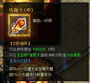 功勋令(中)。双击使用增加50000点功勋。可在[宝物-官职]面板消耗功勋值升级官职。