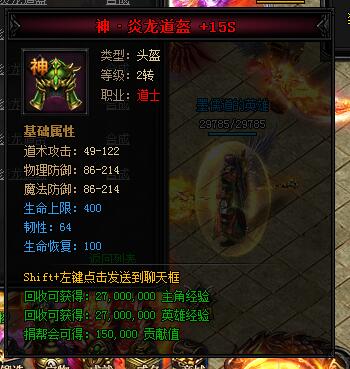 神·炎龙道盔。类型:头盔,等级:2转,职业:道士。基础属性——道术攻击:49-122,物理防御:86-214,魔法防御:86-214,生命上限:400,韧性:64,生命恢复:100。回收可获得:27000000主角经验,27000000英雄经验,捐帮会可得:150000贡献值。