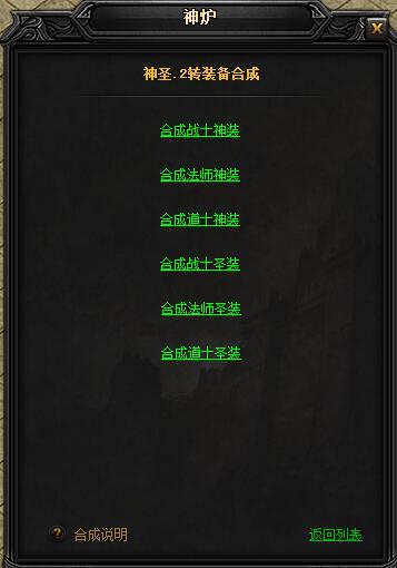 今天我们为大家介绍的主要是神圣·2转装备。打开神装·2转装备合成,我们会发现其中出现了6项。分别是合成战士神装、合成法师神装、合成道士神装、合成战士圣装(新)、合成法师圣装(新)以及合成道士圣装(新)。