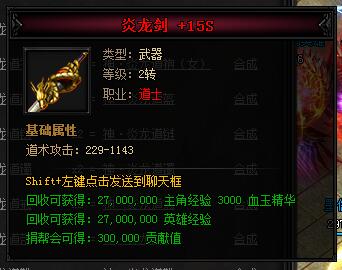炎龙剑。类型:武器,等级:2转,职业:道士。基础属性——道术攻击:229-1143,回收可获得:27000000主角经验,3000血玉精华,回收可获得:27000000英雄经验,捐帮会可得:300000贡献值。