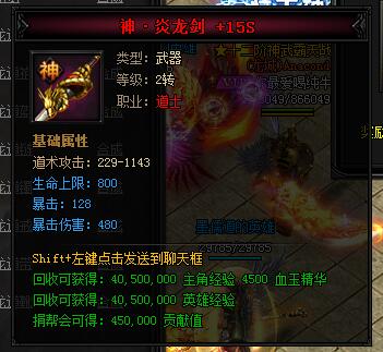 神·炎龙剑。类型:武器,等级:2转,职业:道士。基础属性——道术攻击:229-1143,生命上限:800,暴击:128,暴击伤害:480,回收可获得:40500000主角经验,4500血玉精华。回收可获得:40500000英雄经验,捐帮会可得:450000贡献值。