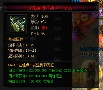 炎龙道袍(男)。类型:衣服,等级:2转,职业:道士,性别:男。基础属性——道术攻击:46-229,物理防御:84-419,魔法防御:84-419。回收可获得:22500000主角经验,2250血玉精华,22500000英雄经验,捐帮会可得:180000贡献值。