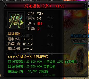 炎龙道袍(女)。类型:衣服,等级:2转,职业:道士,性别:女。基础属性——道术攻击:46-229,物理防御:84-419,魔法防御:84-419,回收可获得:22500000主角经验,2250血玉精华,22500000英雄经验,捐帮会可得:180000贡献值。