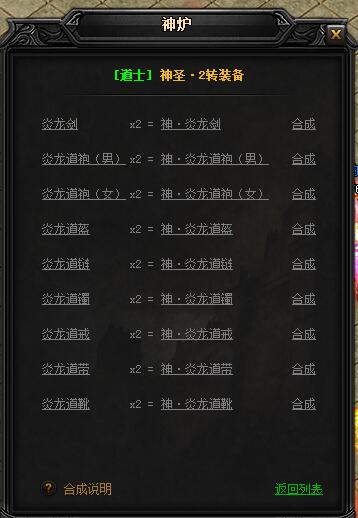 今天来看合成道士神装。点进去之后,便会出现[道士]神圣·2转装备的兑换公式。让我们一起来了解下吧。