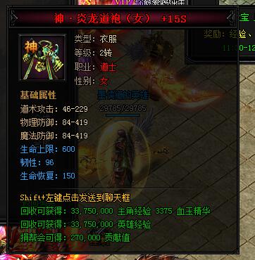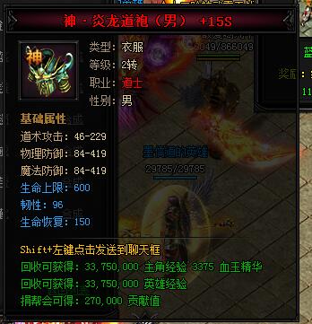 神·炎龙道袍(男)。类型:衣服,等级:2转,职业:道士,性别:男。基础属性——道术攻击:46-229,物理防御:84-419,魔法防御:84-419,生命上限:600,韧性:96,生命恢复:150。回收可获得:33750000主角经验,3375血玉精华,33750000英雄经验,捐帮会可得:270000贡献值。
