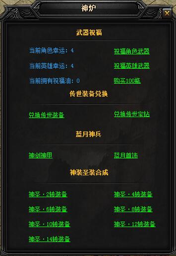 在地图中央,我们会看到一个大神炉。点开之后会发现其中的神装圣装合成追加了六大项。分别是神圣·2转装备、神圣·4转装备、神圣·6转装备、神圣·8转装备、神圣·10转装备以及神圣·12转装备。