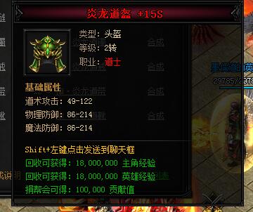 炎龙道盔。类型:头盔,等级:2转,职业:道士。基础属性——道术攻击:49-122,物理防御:86-214,魔法防御:86-214。回收可获得:18000000主角经验,18000000英雄经验,100000贡献值。