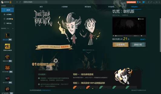 风靡全球的沙盒类PC游戏《饥荒:联机版》相信很多玩家都早有耳闻,TGP 联合Supernova 获得饥荒的全球正版授权, 10月15开启抢先预售,10月20日正式开放下载上线,快快告知你的小伙伴们一起来闹“饥荒”吧!