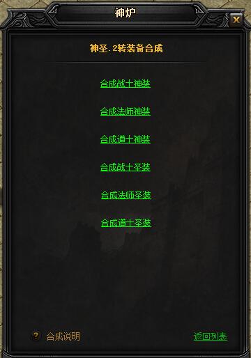 今天我们为大家介绍的主要是神圣·2转装备。打开神装·2转装备合成,我们会发现其中出现了6项。分别是合成战士神装、合成法师神装、合成道士神装、合成战士圣装(新)、合成法师圣装(新)以及合成道士圣装(新)。