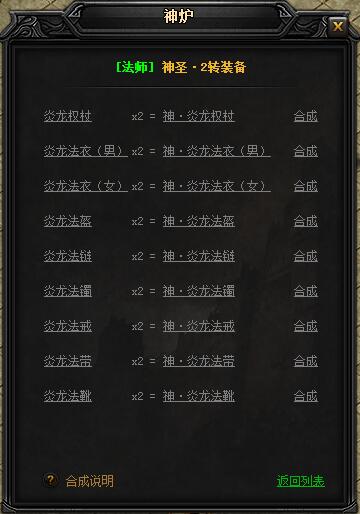 今天来看合成法师神装。点进去之后,便会出现[法师]神圣·2转装备的兑换公式。让我们一起来了解下吧。