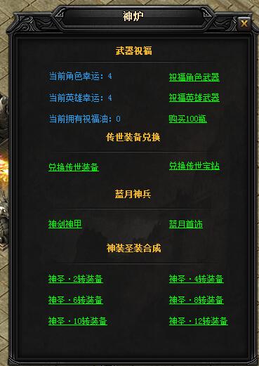 在地图中央,我们会看到一个大神炉。点开之后会发现其中的神装圣装合成追加了六大项。分别是神圣·2转装备、神圣·4转装备、神圣·6转装备、神圣·8转装备、神圣·10转装备以及神圣·12转装备。