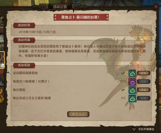 各位亲爱的猎人们,白猫神社的巫女菲菲近期发布了全新的天秤座星盘占卜委托!猎人们可以通过完成游戏内活动公告面板中的小任务或者日常狩猎任务来获取本次活动的星盘福袋,打开菲菲的星盘,使用福袋点亮星星,完成星座连线即可赢取天秤座武器时装,还有银币,专属称号等大奖等你哦!