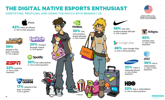 此外,Newzoo根据调查数据给北美电竞观众画了个像:他们是互联网一代和消费主义者,更愿意为虚拟服务付钱;他们爱看HBO,爱玩皇室战争,爱看Twitch,爱用Spotify(全球最大正版音乐服务平台)……