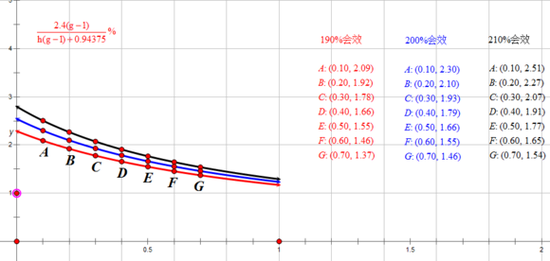 若要算出会心h的收益曲线,必须设定会效g、未命中m和识破n的值,以现在大众装备属性为参考,设未命中m为0,识破n为10%,计算在190%、200%、210%会效下100点会心收益: