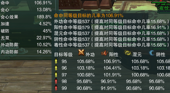 命中率取决于自身命中和BOSS等级,97级目标要求105%命中,98级目标要求110%命中,99级目标要求115%命中。将鼠标放在命中上悬停,可以看到当前阳性命中对各等级目标的命中机率。