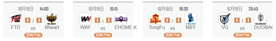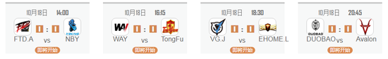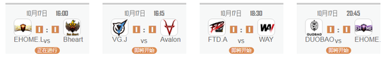 10月17日率先出场的将是EHOME.L和BHEART,上周EHOME.L状态很好,目前的积分已经紧紧的咬住了前面几支竞争对手,而BHEART上周成绩不够乐观,但是现在依然有追赶的机会,这场比赛对于双方来说都 一场生死之战,也必将是十分精彩。随后是当前小组积分第一的VG.J对战积分垫底的AVALON,老队长能否延续上周的精彩发挥,继续扩大积分优势,也非常的让人期待。而FTD.A积分已经从第一滑落下来,并且被各路豪强团团包围,如果不能从WAY手上全取2分,将会给之后的赛程带来巨大的压力,相信他们也会努力证明自己。17日最后一场将是多宝对阵EHOME.K,是多宝继续用小狗打法一路横扫?还是EHOME.K开始自己的绝地反击?一切都将在比赛中见分晓。