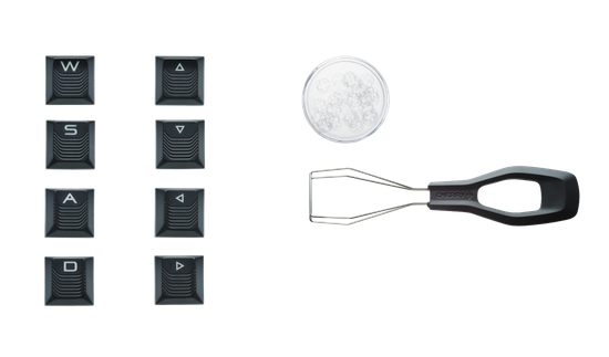 除了两款键盘外,樱桃发布了一款游戏性能键帽配件包CHERRY PERFORMANCE KEY KIT,为FPS射击类游戏用户准备,内置8个新模具透光游戏性能键帽,两侧有固定卡扣式手臂,固定在轴上,可致触发行程从2mm缩短至1.6mm,表面采用轮胎纹理,增强了摩擦力,边缘采用了堤坝高度设计,防止手指滑落。钢丝拔键器1个,方便用户更换键帽,并提供40个轴和键帽之间的垫片,每个垫片可缩短0.125mm的键程,每个轴推荐至多使用4个,这样如果使用了垫片并使用游戏性能键帽,触发行程至多可缩短至1.1mm,最多的操作从键盘改变。
