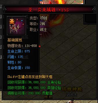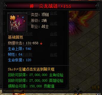 神·炎龙战链。类型:项链,等级:2转,职业:战士。基础属性——物理攻击:131-658,生命上限:540(蓝色),韧性:64(蓝色),生命恢复:120(蓝色)。回收可获得:27000000主角经验,27000000英雄经验,捐帮会可得:150000贡献值。