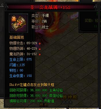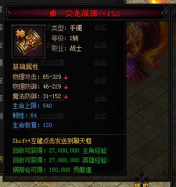 神·炎龙战镯。类型:手镯,等级:2转,职业:战士。基础属性——物理攻击:65-329,物理防御:46-229,魔法防御:31-152,生命上限:540,韧性:64,生命恢复:120。回收可获得:27000000主角经验,27000000英雄经验,150000贡献值。
