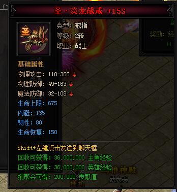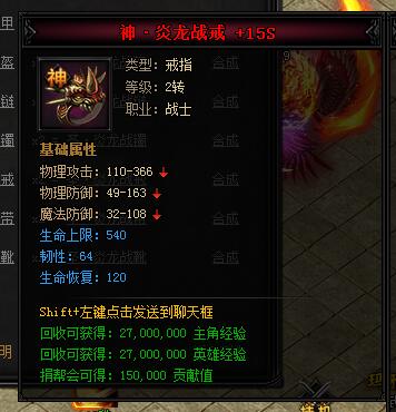 神·炎龙战戒。类型:戒指,等级:2转,职业:战士。基础属性——物理攻击:110-366,物理防御:49-163,魔法防御:32-108,生命上限:540(蓝色),韧性:64(蓝色),生命恢复:120(蓝色)。回收可获得:27000000主角经验,27000000英雄经验,150000贡献值。