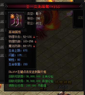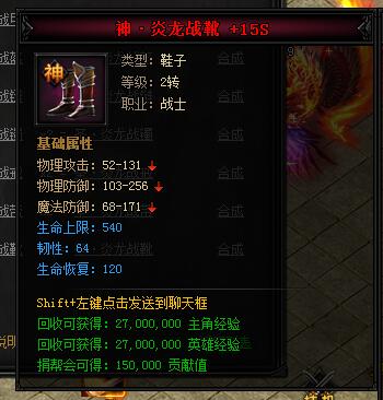 神·炎龙战靴。类型:鞋子,等级:2转,职业:战士。基础属性——物理攻击:52-131,物理防御:103-256,魔法防御:68-171,生命上限:540(蓝色),韧性:64(蓝色),生命恢复:120(蓝色)。回收可获得:27000000主角经验,27000000英雄经验,捐帮会可得:150000贡献值。