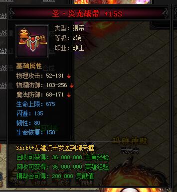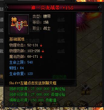 神·炎龙战带。类型:腰带,等级:2转,职业:战士。基础属性——物理攻击:52-131,物理防御:103-256,魔法防御:68-171,生命上限:540(蓝色),韧性:64(蓝色),生命恢复:120(蓝色)。回收可获得:27000000主角经验,27000000英雄经验,150000贡献值。