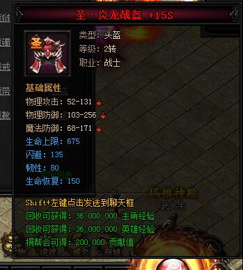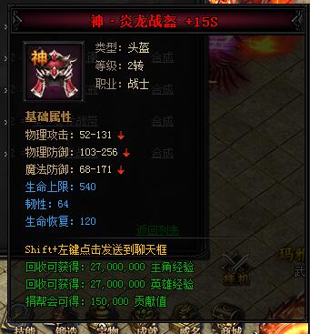 神·炎龙战盔。类型:头盔,等级:2转,职业:战士。基础属性——物理攻击:52-131,物理防御:103-256,魔法防御:68-171,生命上限:540(蓝色),韧性:64(蓝色),生命恢复:120(蓝色)。回收可获得:27000000主角经验,27000000英雄经验,150000贡献值。