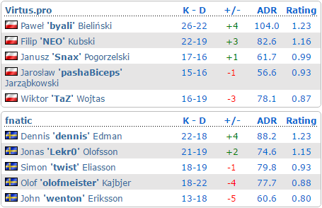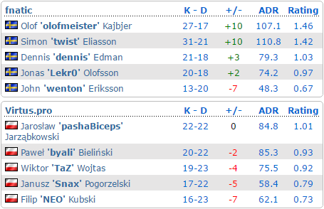 输掉第一场比赛的fnatic仍然需要为小组排名而战斗,因为SK在对阵HR的时候取得了两场大比分胜利,如果fnatic想获得小组第二的位置,他们就必须在mirage上战胜VP。fnatic上半场做T攻势凶猛,取得8-4的领先,VP缓过神来连得2分将比分迫近,上半场最后一局,twist完成一次1v3将半场比分锁定在9-6。