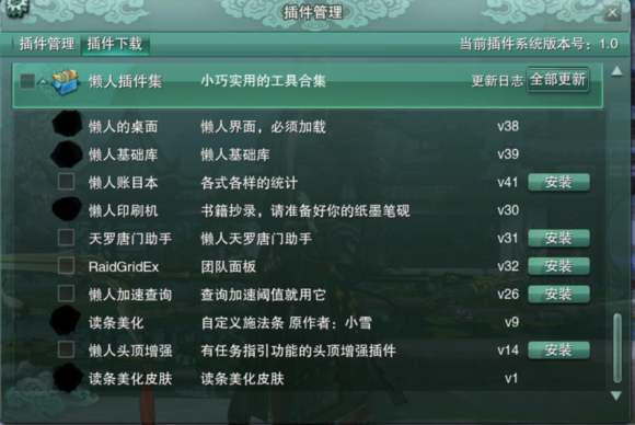 如图所示,一共有5款插件集,当然萌新的界面中,5款插件集后面都是一个安装按钮,而许多不明就里的萌新,会一口气把5个安装全部点掉,完美安装了所有插件——当然这样你在PVP的时候会发现你的界面会非常“绚丽”,眼花缭乱。