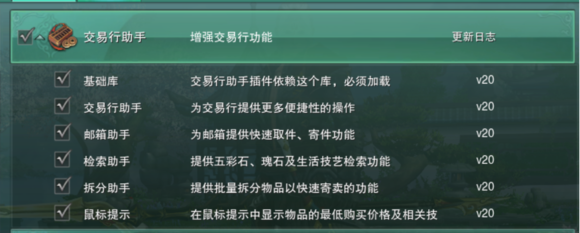 这个插件推荐完全安装,通过图示中的插件功能介绍,我们可以清楚地看到,它会极大程度地方便游戏内的交易、邮件、物品等功能。
