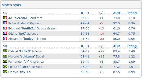 近期SK的状态稍有回升,而G2在拿下ECS冠军后状态一直一般,两队本应激烈争斗的比赛却在开局呈现了一边倒的局势,进攻完全没有套路的G2在SK面前根本无力抵抗,fallen的发挥更是在数个少打多的残局上演了狙击秀,最终G2更是一分未得进入下半场,丢出手枪局后0-16完败SK。