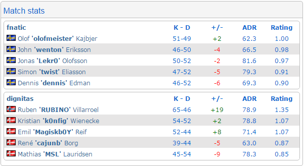 下半场易边进入防守方的Fnatic更是打的如鱼得水,dennis与olof双雄的发挥毫无瑕疵可言,节奏被带走的dignitas毫无抵抗之力仅取2分以9-16输下了第一场。