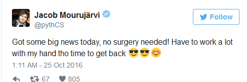 北京时间10月25日,CS:GO劲旅战队NiP选手pyth在推特上宣布自己再也不用手术了,很快将会重返战队。