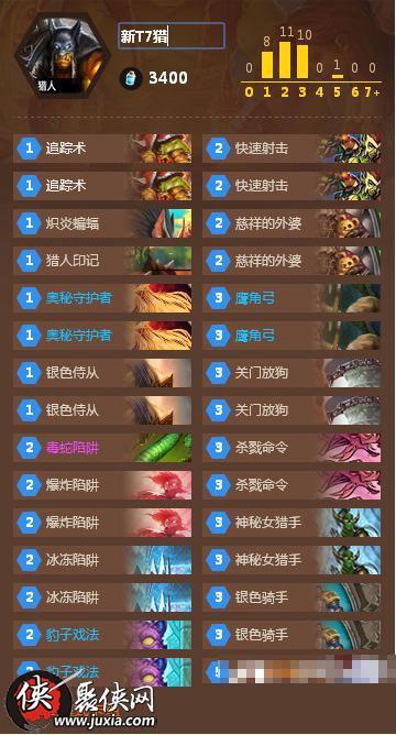 追踪术:找关键卡牌时非常好用,比如起手有女猎手,那么就可以利用追踪术迅速找到奥秘来进行配合,适当时候下的奥秘总能起到奇效。而在中期也可以以亏一费水晶的代价,来找到当前回合最合适的上场卡牌,T7猎没有什么卡牌不能弃的,也不可能打到牌库用干。