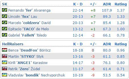 首场比赛在overpass上进行,SK上半场先做CT,状态回暖的FalleN给予了对手极大的打击,他拿着狙击枪四处游走击杀对手,fnx也一如既往地表现出色,SK取得9-0的开局之后HR才得到第一分。整个比赛完全在SK的掌控之中,上半场SK取得13-2的领先。