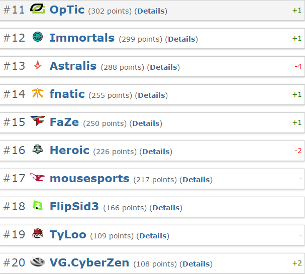 而另一方面,中国CSGO界的领头者Tyloo和VG.CyberZen战队也在此次排名中上榜分别位列第19和20名。这也是VG电子竞技俱乐部 首次进入世界前20的行列!相比于国外,中国的CSGO才刚刚起步,中国两支战队能取得如此排名已经是十分出色,相信随着CSGO在中国的推出和发展,中国战队的成绩也将越来越好,让我们共同期待中国CSGO战队在未来带给我们的精彩表现!