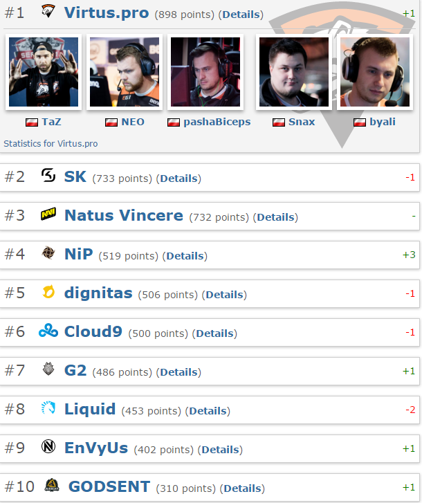 HLTV.org公布最新CSGO战队世界排名,波兰雄鹰VP荣登世界第一!SK战队在统治了大半年的时间后终于跌下神坛位列第二,其身后是虎视眈眈的乌克兰豪门NaVi以及信仰队NiP。各队排名虽有先后但积分相差并不是很大,CSGO群雄争霸的时代将要到来了吗?