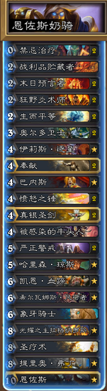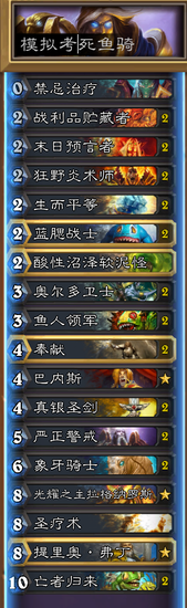会长不服,想要证明圣光的地位,一套超级慢的恩佐斯骑横空出世,并且加入了哈里森来对抗萨满和战士,实测结果挺不错,会长最终拿到了7-3的成绩,不过离12胜的小目标还相差很远。不过至少可以看到对目前环境的适应性,也许再经过一些改良的骑士有希望在英雄乱斗中有更好的表现。