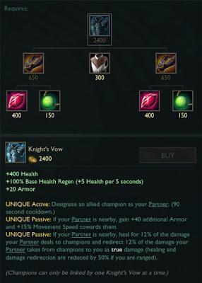 唯一被动:当在你的伙伴附近时,伙伴对英雄造成伤害的12%会回复你的生命值,而且伙伴受到的12%伤害将以真实伤害转移到自己身上(范围伤害和治疗效果减半)。每个英雄只能同时被一件骑士的誓约链接。