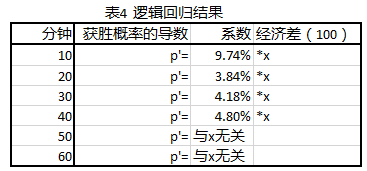 这里就比较简单了,笔者对10、20、30、40、50、60分钟的红蓝双方经济差和获胜情况进行了逻辑回归,计算出来的结果如下: