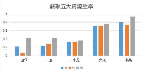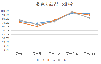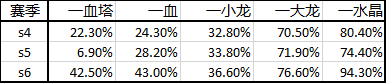 注意:这里的百分比,不是说拿了S4一血塔的胜率为22.3%,而是说,在S4,获取一血塔可以帮助队伍提高22.30%的胜利可能。